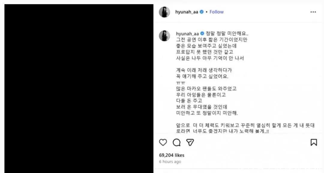 事后,泫雅在社交媒体上向粉丝道歉,她写道:"那是上一次演出后,虽然中间休息的时间很短,但我真的很想以'更好的模样'站在大家面前。结果却觉得自己完全不专业。"她坦言对晕倒瞬间的记忆已经模糊:"其实,我自己也什么都记不得了。